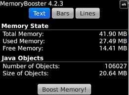 MemoryBooster hanya meningkatkan memori runtime. Mendefinisikan memori.meningkatkan BlackBerry ® s penggunaan memori untuk menjalankan aplikasi yang memiliki efek positif pada kecepatan keseluruhan dari BlackBerry ®. MemoryBooster tidak melakukan apa pun dengan media kartu memori yang merupakan ruang untuk penyimpanan file saja dan tidak akan memiliki efek pada kecepatan telepon.